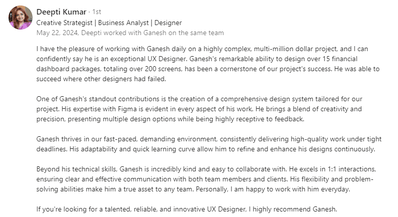 It is an experienced UX Designer with 11 years in the design industry. It is skilled in creating intuitive user experiences across various domains such as banking, healthcare, Manufacturing Supply chain, etc. Proficient in using tools like Figma, Adobe XD, and Sketch. Expertise in user-centered design, user research, usability testing, and data analysis. Proven ability to manage and deliver complex projects, collaborating effectively with cross-functional teams to align UX designs with business goals. Committed to innovation and continuous improvement, consistently delivering user-centric solutions that enhance customer satisfaction and drive business success.